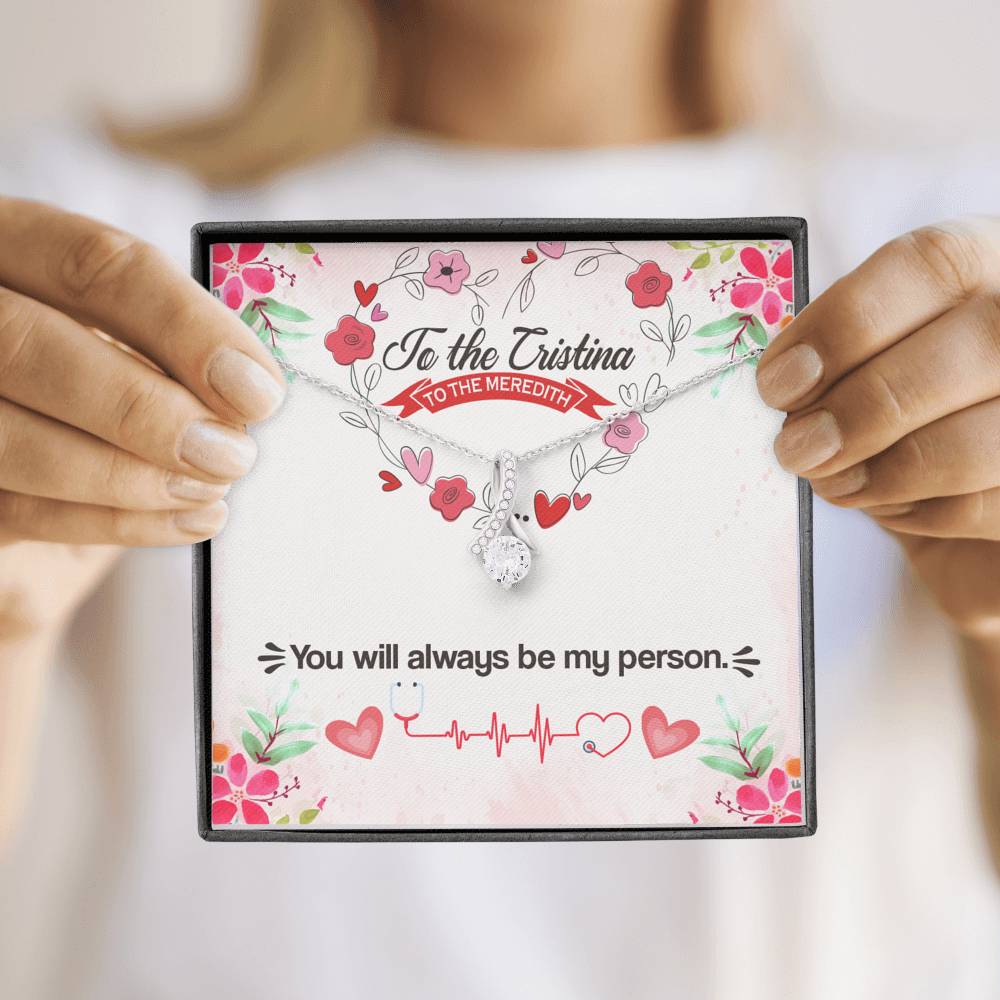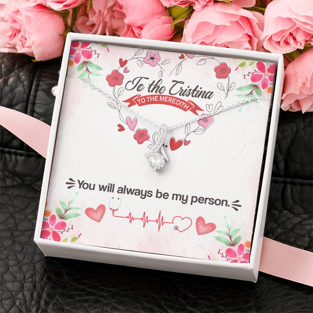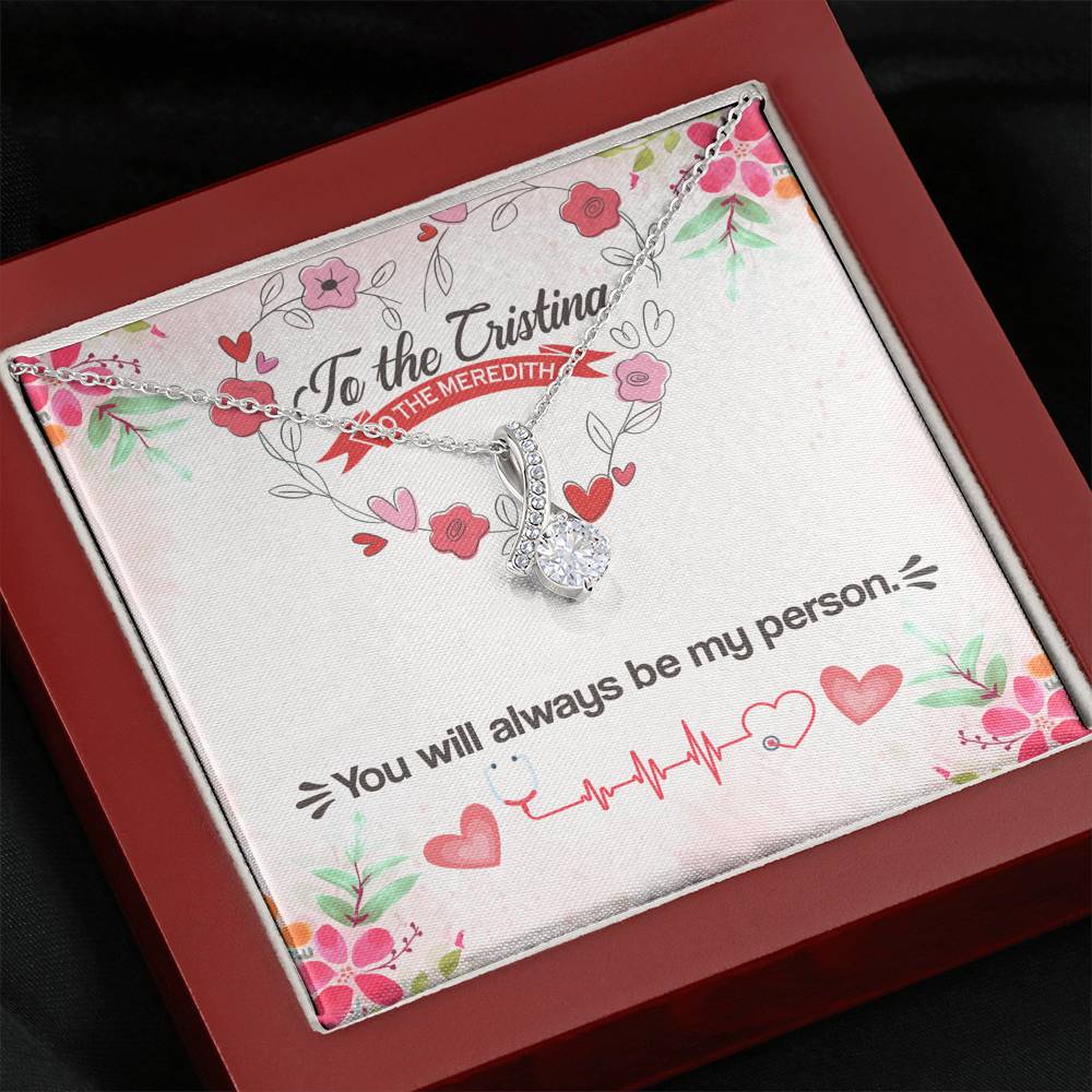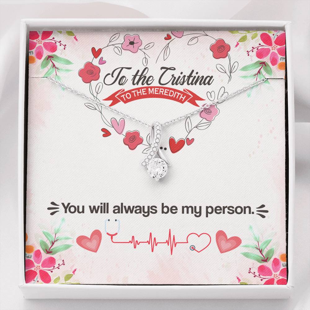 Melt her heart with this ALLURING BEAUTY necklace gift! The petite ribbon shaped pendant is finished with 14K white gold over stainless steel, and is embellished with dainty clear crystals surrounded by a sparkling 7mm round cut Cubic Zirconia.