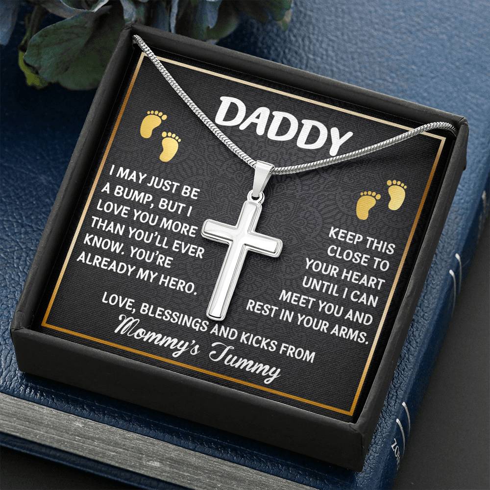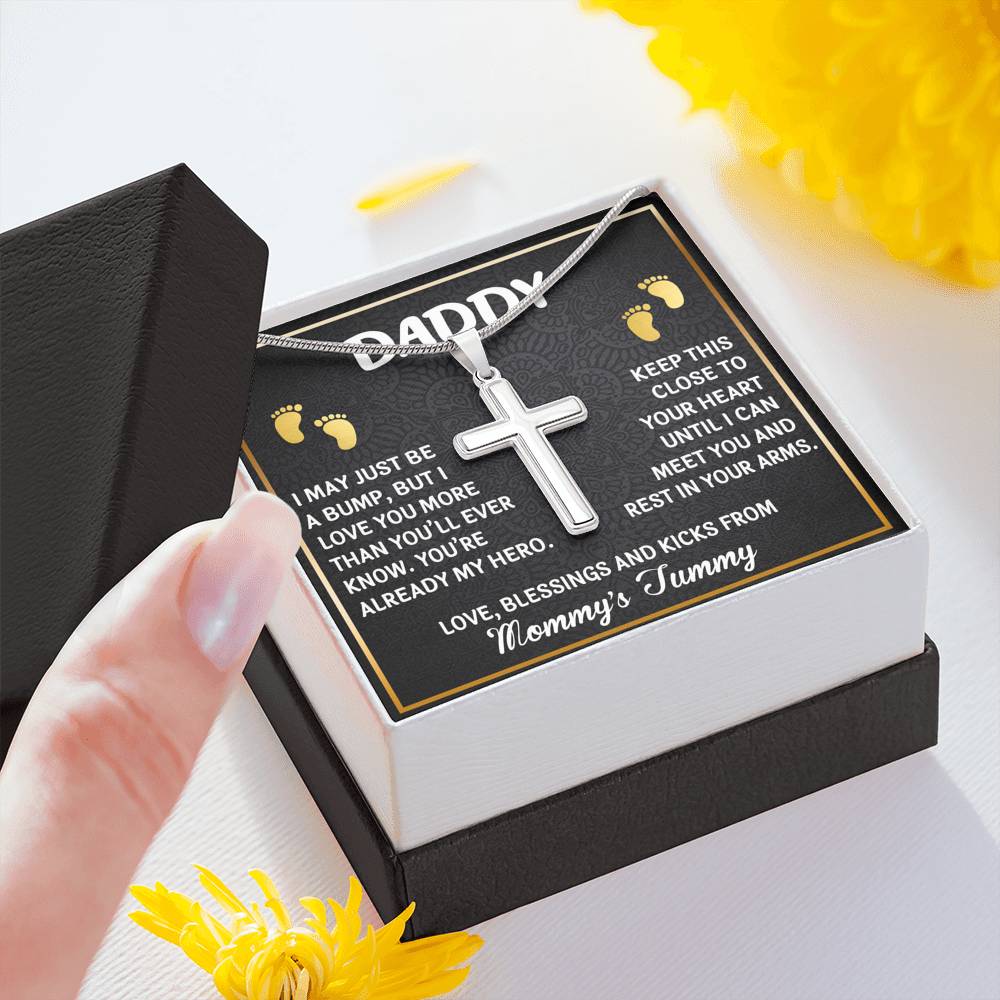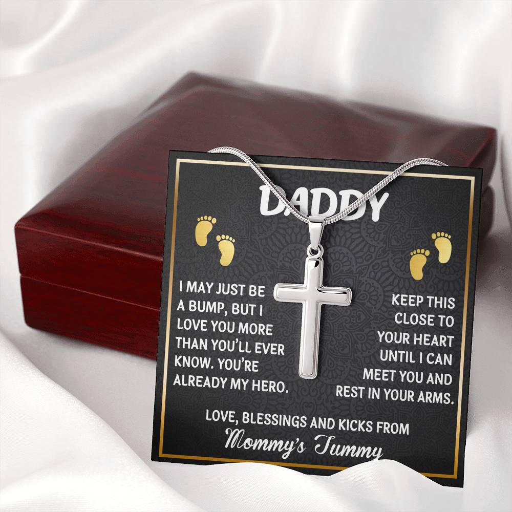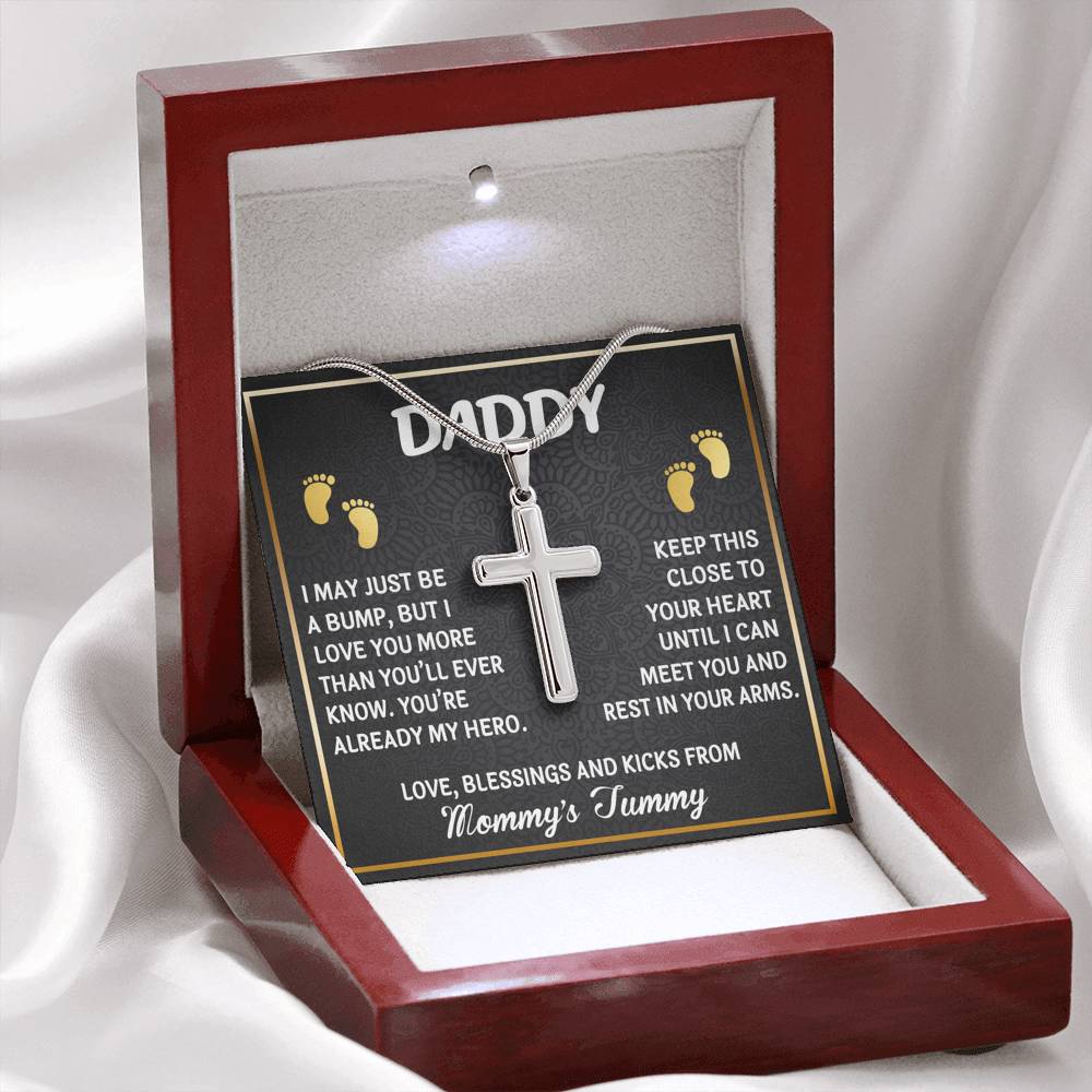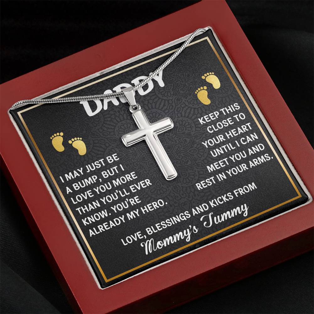 "I may just be a bump, but I love you more than you'll ever know. You're already my hero. Keep this close to your heart until I can meet you and rest in your arms. Love, blessings and kicks from Mommy's Tummy"