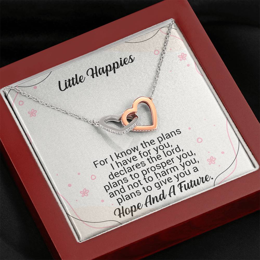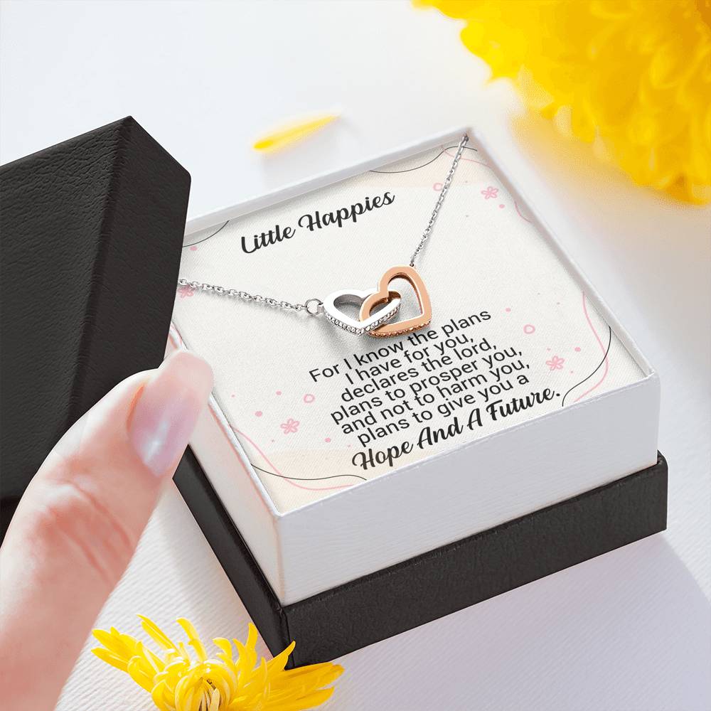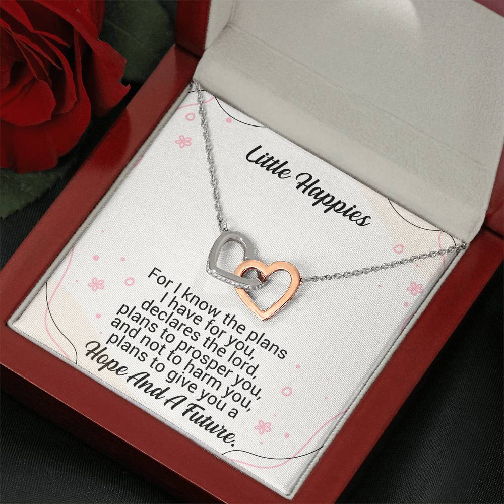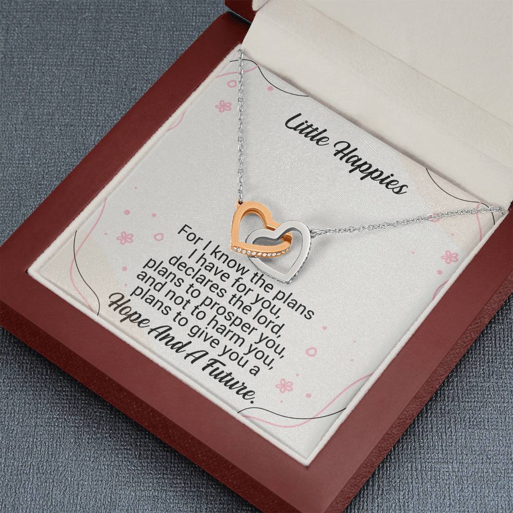 Two hearts embellished with Cubic Zirconia stones, interlocked together as a symbol of never-ending love. Made with high quality polished surgical steel. Cable chain measures 18 inches with a 4 inch extension, and fastens with a lobster clasp.