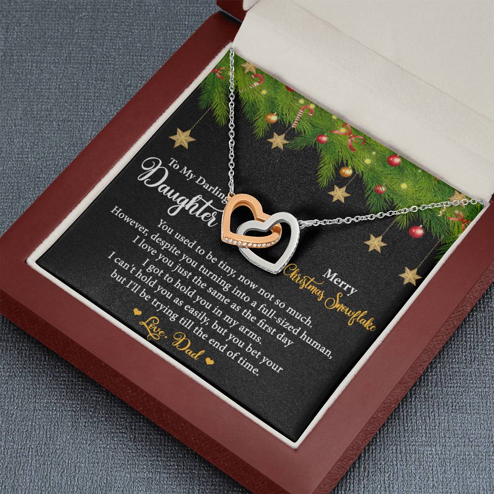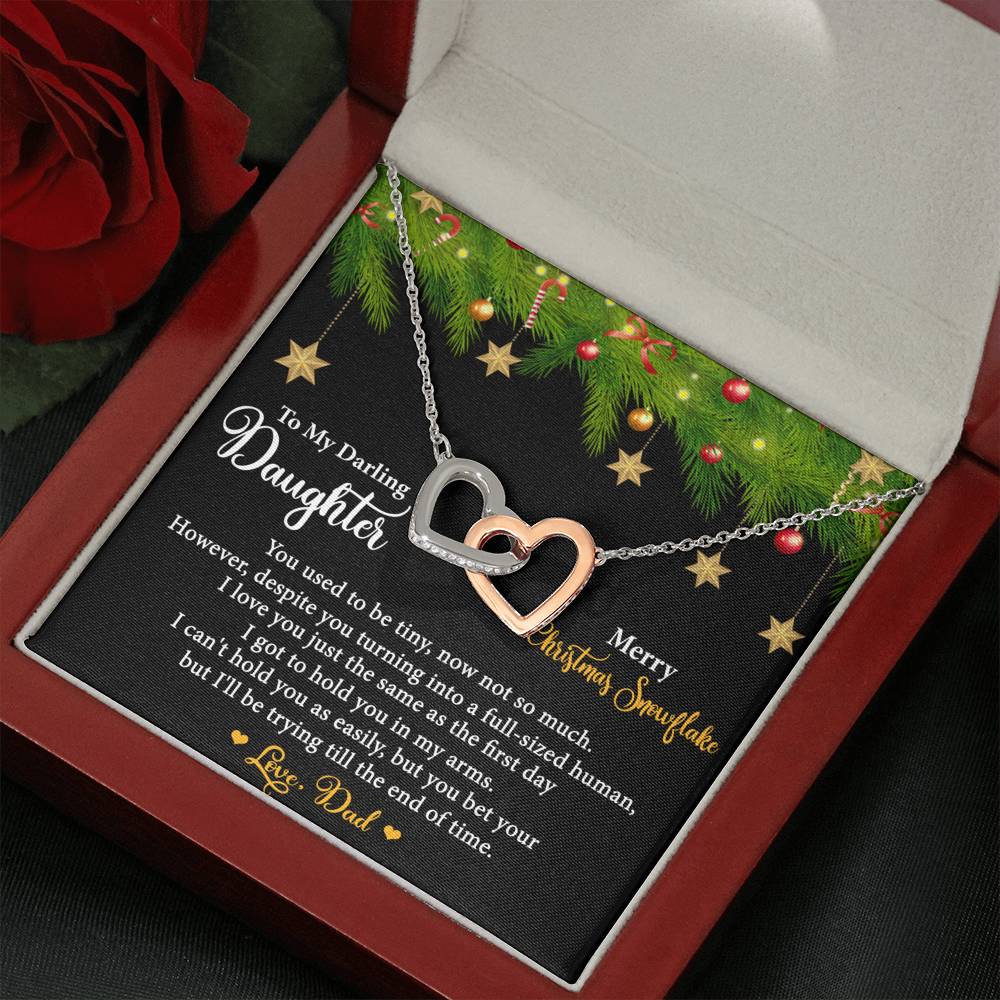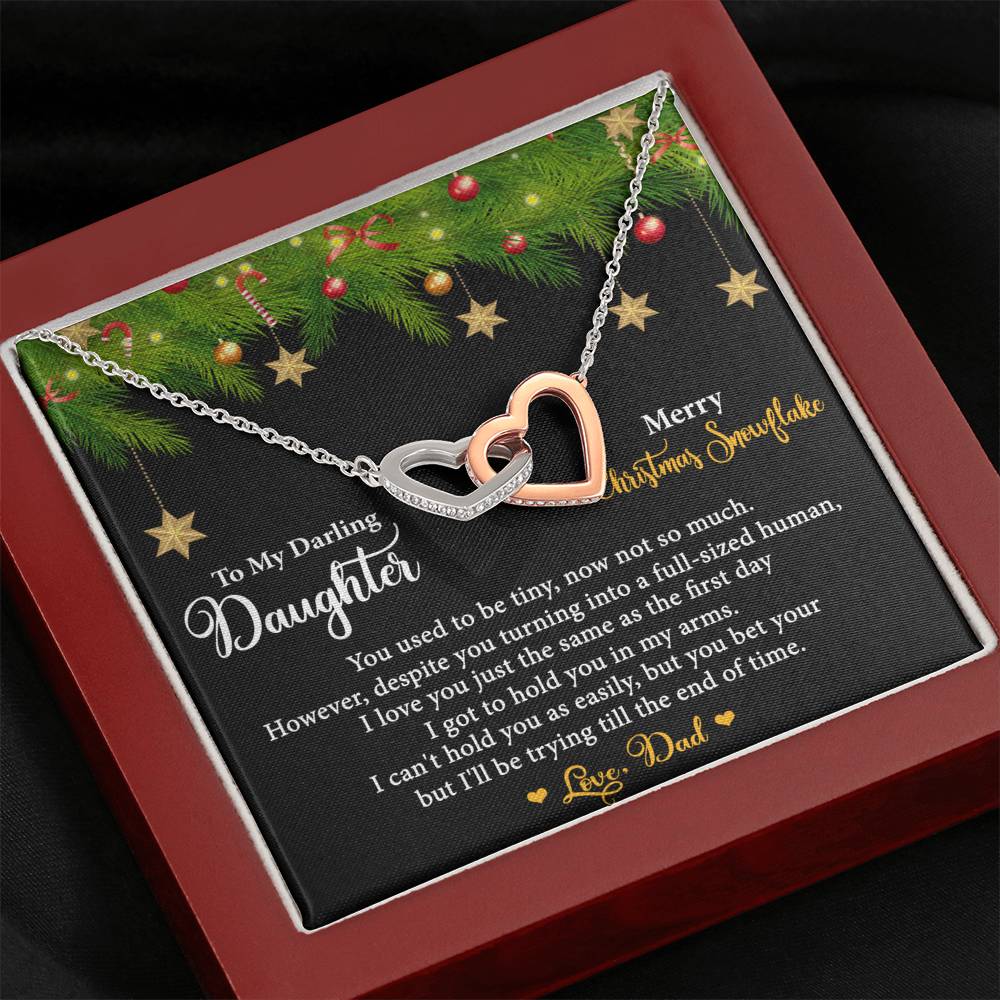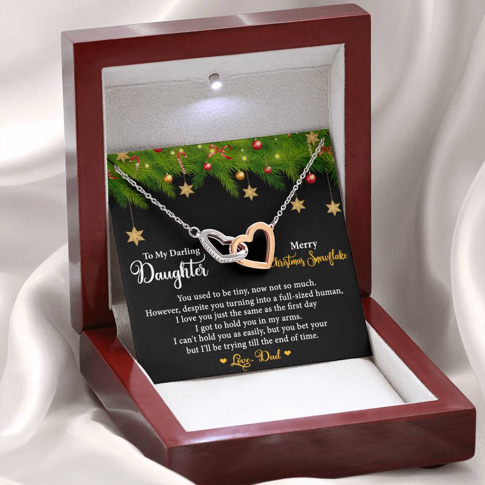 Two hearts embellished with Cubic Zirconia stones, interlocked together as a symbol of never-ending love. Made with high quality polished surgical steel. Cable chain measures 18 inches with a 4 inch extension, and fastens with a lobster clasp.