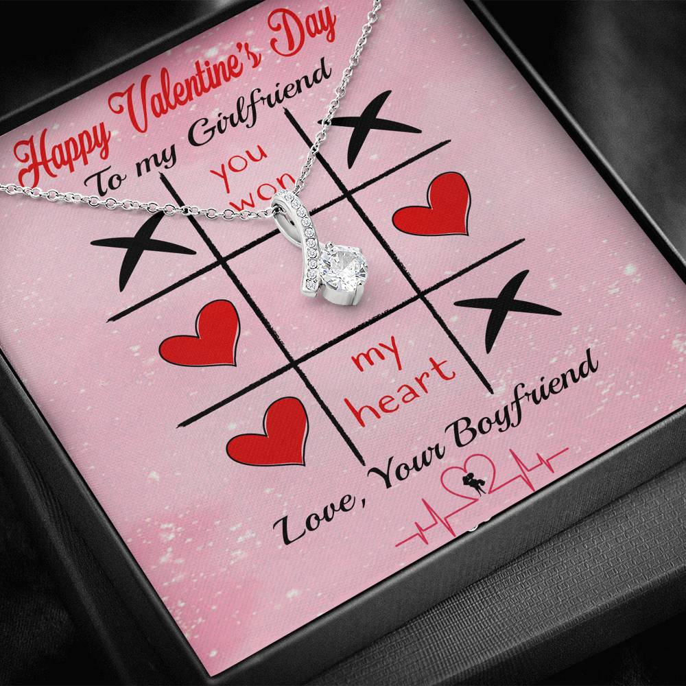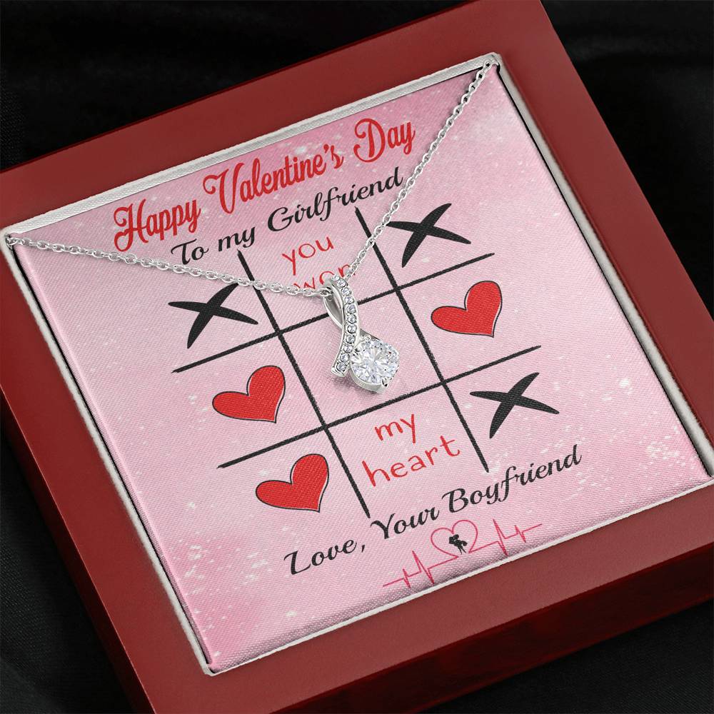 Melt her heart with this ALLURING BEAUTY necklace gift! The petite ribbon shaped pendant is finished with 14K white gold over stainless steel, and is embellished with dainty clear crystals surrounded by a sparkling 7mm round cut Cubic Zirconia.
