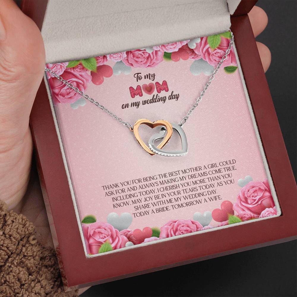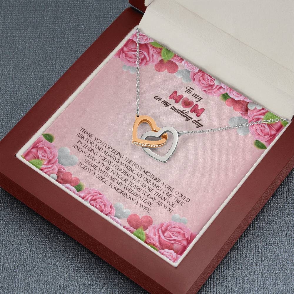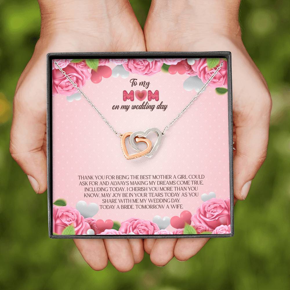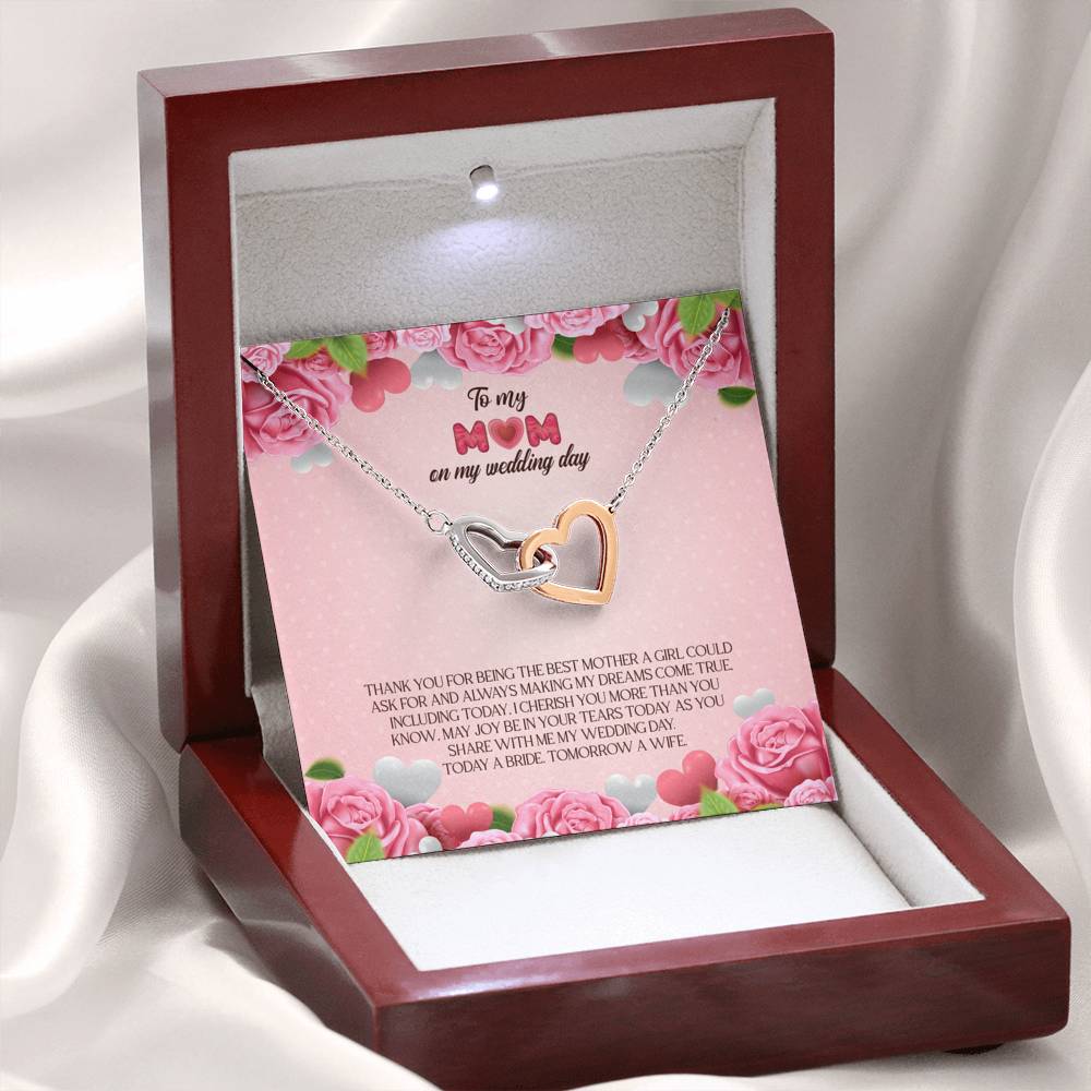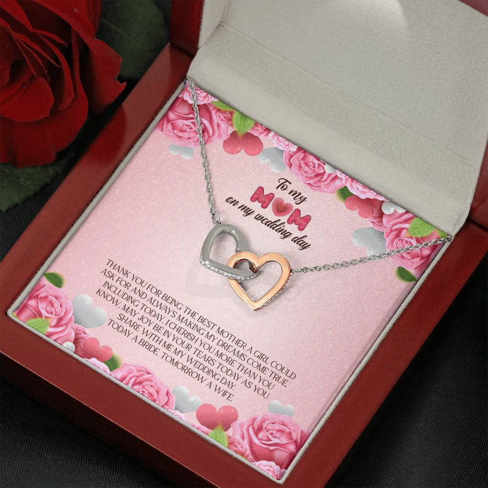 "Thank you for being the best mother a girl could ask for and always making my dreams come true. Including today, I cherish you more than you know. May joy be in your tears today as you share with me my wedding day. Today a bride. Tomorrow a wife."
