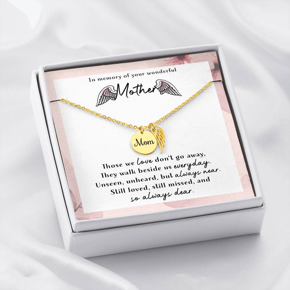Keep Mom close to your heart with this loving Remembrance Necklace. "Mom" is engraved on the dainty hand polished coin and enhanced in black enamel, paired with a delicate polished Angel Wing tag on an adjustable cable chain measuring 18"-22" with a lobster clasp closure. Available in Polished Stainless Steel and 18k Yellow Gold over Stainless Steel. Pendant Dimensions: Circle: 0.5" (13mm), Wing: 0.625" (10mm)