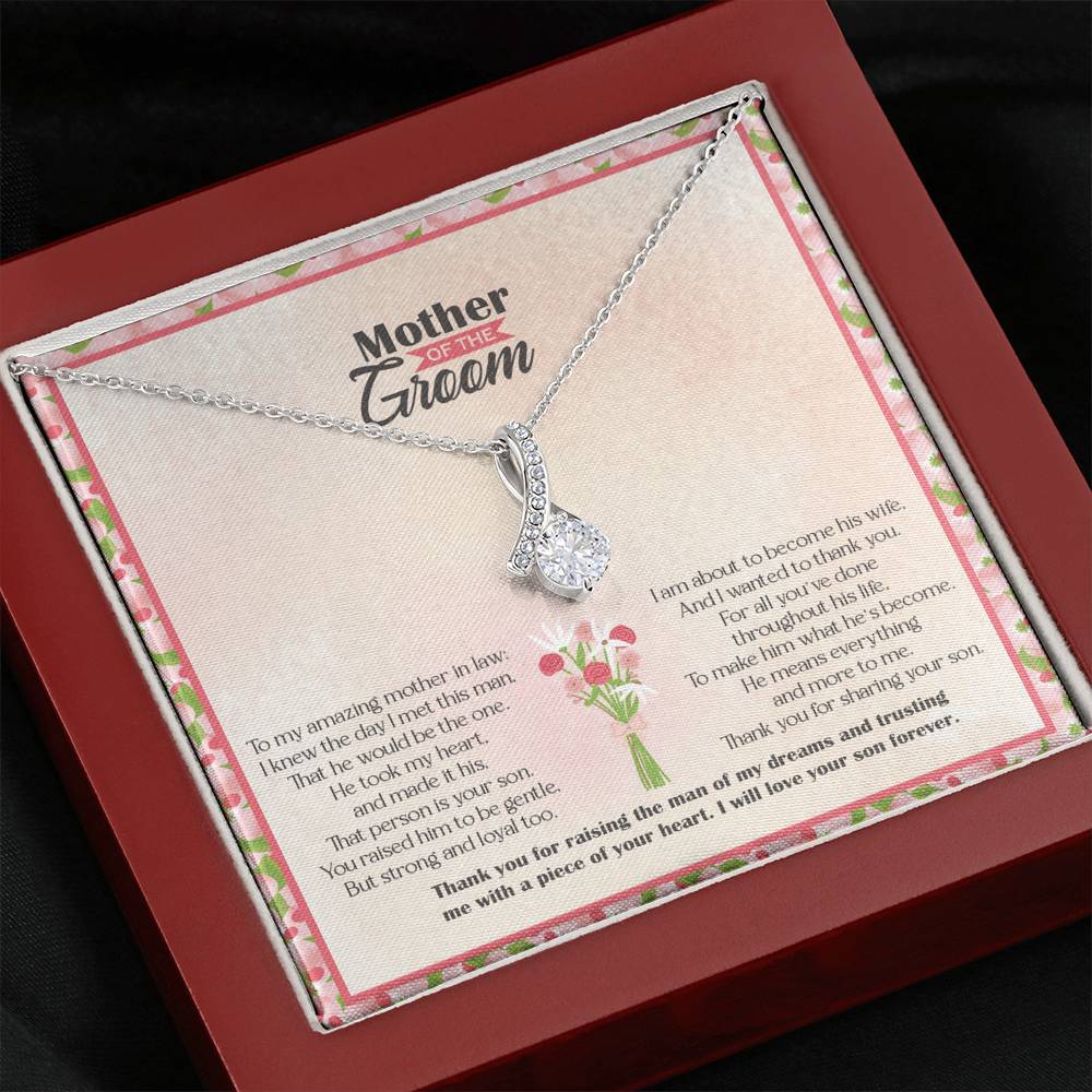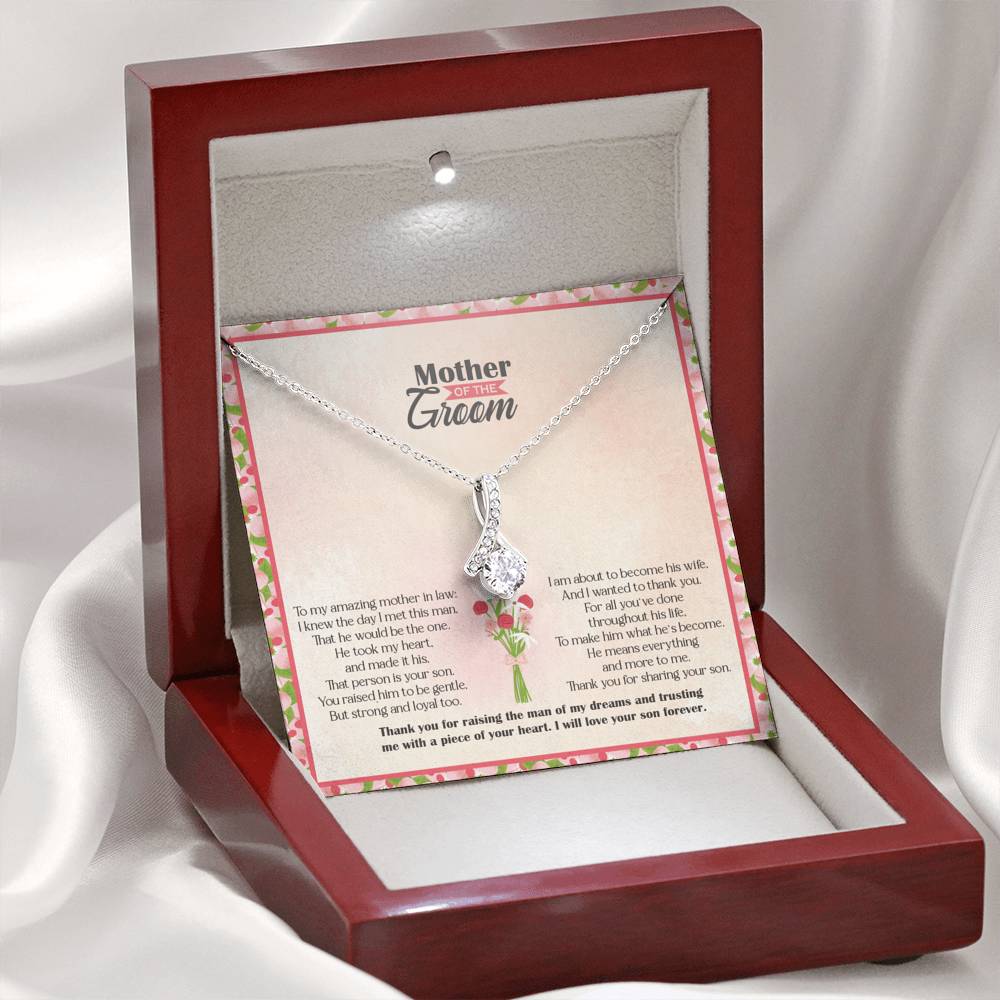 "To my amazing mother-in-law: I knew the day I met this man, that he would be the one. He took my heart and made it his. That person is your son. You raised him to be gentle. But strong and loyal too. I am about to become his wife and I wanted to thank you for all you've done throughout his life. To make him what he's become. He means everything and more to me. Thank you for sharing your son. Thank you for raising the man of my dreams and trusting me with a piece of your heart. I will love your son forever."